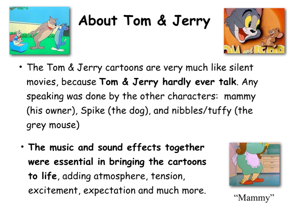 Year 7 film music composition project for KS3 music in school. Background to Tom and Jerry Intro to Mickey-Mousing Intro to Diabetic and non-diagetic music Film analysis - looking for mickey-mousing and diabetic music etc Main project is to create a new soundtrack using Garageband for a short Tom and Jerry clip. This movie was originally an advert for milkshake on Israeli TV, and contains a typical chase scene in the middle.